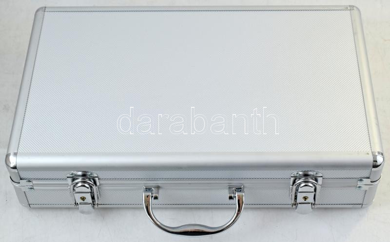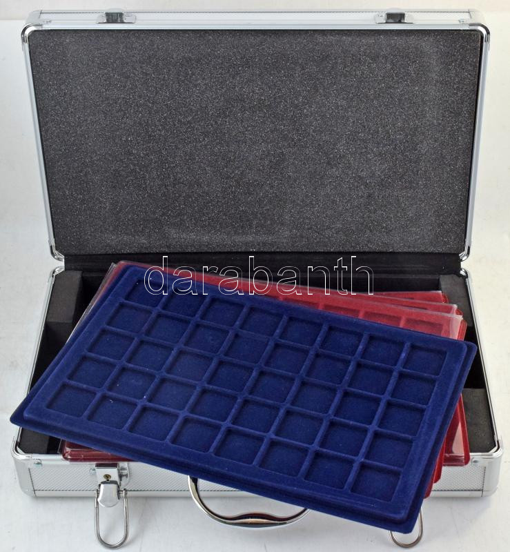 Alumínium érmetartó koffer használt, de újszerű állapotban, benne 4db érmetartó tálca: 2db 35x35mm-es és 1-1 darab 33mm és 32mm-es fészkekkel. Összesen 150 férőhely.