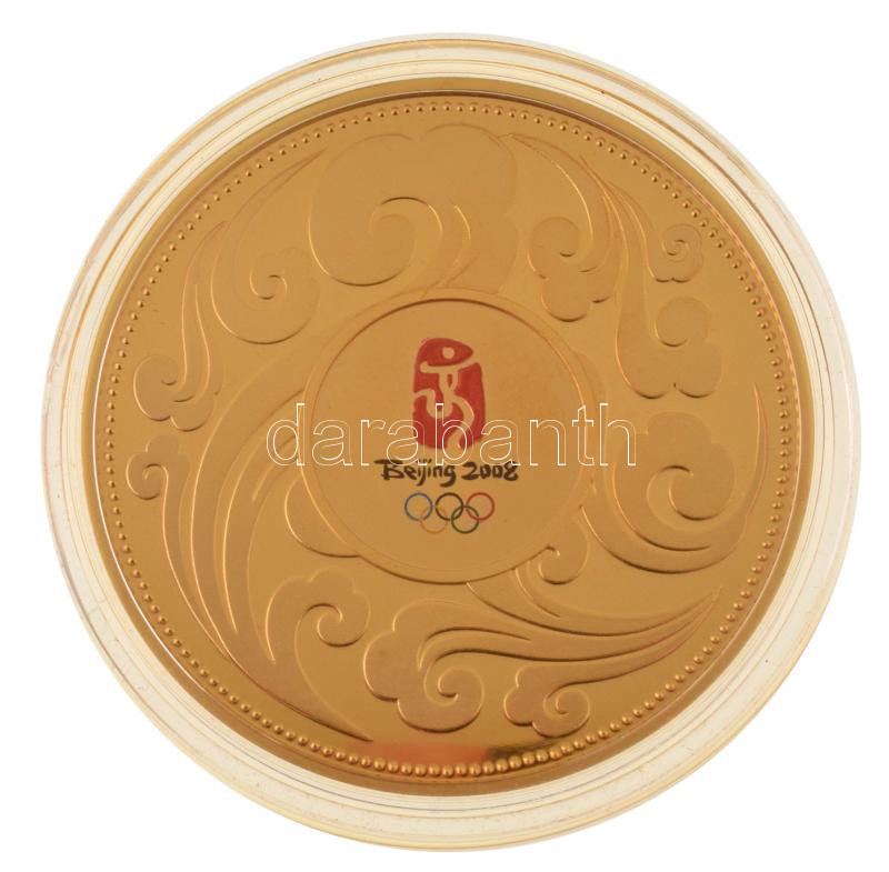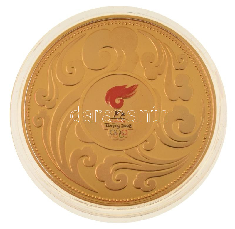 Kína 2008. "XXIX. Olimpia - Peking 2008" aranyozott, multicolor bronz emlékérem, eredeti, kissé kopott dísztokban, tanúsítvánnyal és leírással (55mm) T:PP China 2008. "XXIX Olympic Games - Beijing 2008" gilt, multicolored bronze commemorative medallion in its original, slightly worn case, with certificate and a description sheet (55mm) C:PP