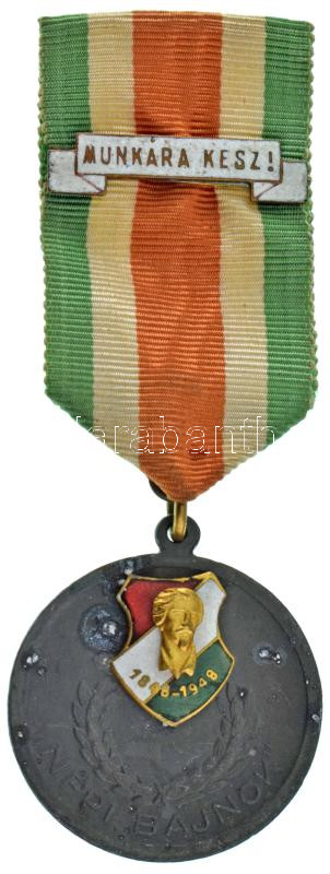 1948. "Népi Bajnok" Zn sakk díjérem zománcozott "Petőfi" rátéttel az 1848-1849-es forradalom 100. évfordulója alkalmából, nemzetiszín mellszalagon, zománcozott "Munkára kész!" felirattal (36mm) T:XF oxidáció
