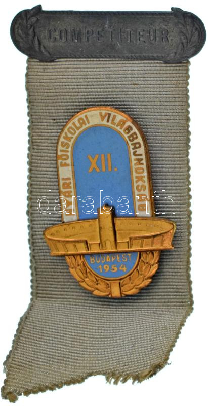 1954. "XII. Nyári Főiskolai Világbajnokság - Budapest 1954" aranyozott, zománcozott bronz jelvény szalagon, "Compétiteur (Versenyző)" feliratú fém kitűzővel T:AU