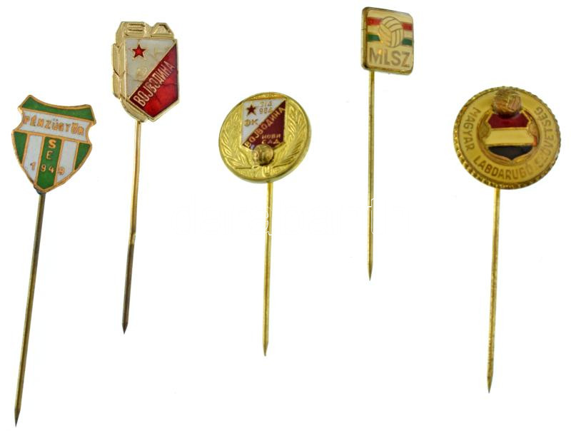 Beschreibung: 5db-os labdarúgás témájú jelvénytétel, benne MLSZ (Magyar Labdarúgó Szövetség, 2xklf), FK Vojvodina (2xklf), Pénzügyőr SE T:AU,XF