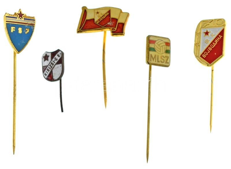 5db-os labdarúgás témájú jelvénytétel, benne MLSZ (Magyar Labdarúgó Szövetség), FSJ (Jugoszláv Labdarúgó Szövetség), FK Vojvodina (2xklf), Kinizsi SE (FTC) T:AU-VF egyik tű törött