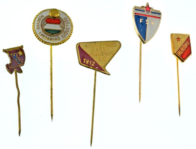 5db-os labdarúgás témájú jelvénytétel, benne MLSZ (Magyar Labdarúgó Szövetség), FSV (Vajdasági Labdarúgó Szövetség), FK Vojvodina, Békéscsabai Előre Spartacus SC, Vörös Lobogó (MTK) T:AU,XF