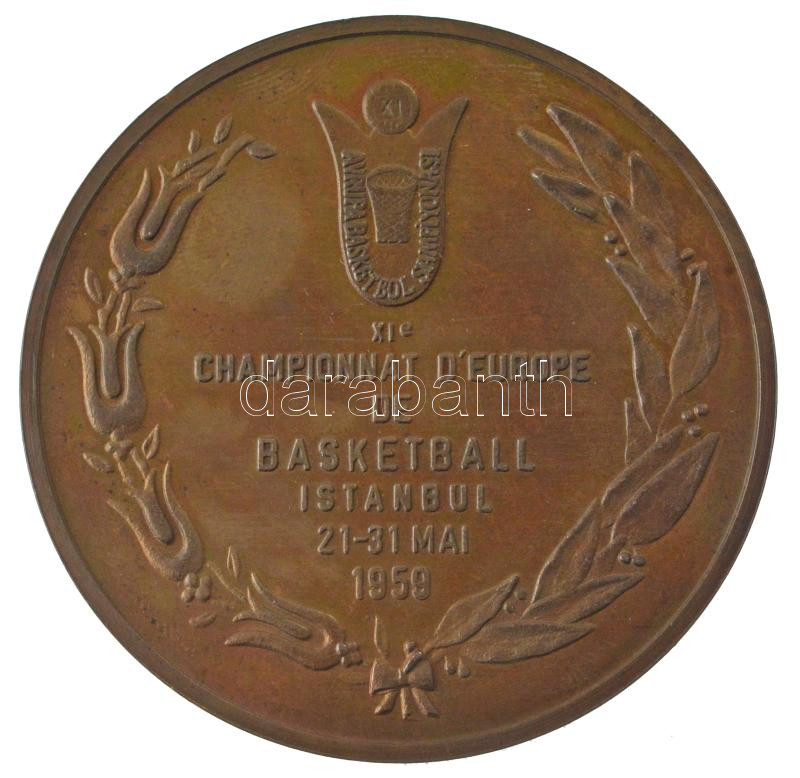 Törökország 1959. "Kosárlabda Európa Bajnokság, Isztambul" kétoldalas bronz emlékérem eredeti tokban (71mm). A tornát a Szovjetunió nyerte meg, miután a döntőben 83-72-re legyőzte Csehszlovákiát. T:UNC Turkey 1959. "Basketball European Championship, Istanbul" kétoldalas bronz emlékérem eredeti tokban (71mm). The tournament won by the Soviet Union, they beat Czechoslovakia in the final to 83-72 C:UNC