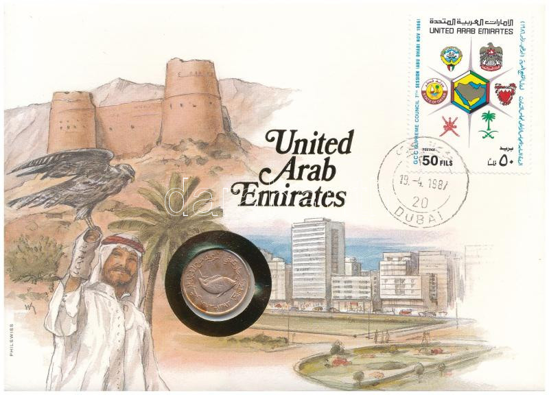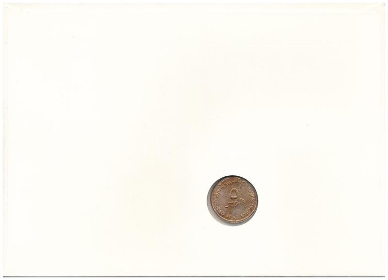 Egyesült Arab Emirátusok 1973. 5f bronz felbélyegzett borítékban, bélyegzéssel, német nyelvű leírással T:AU patina United Arab Emirates 1973. 5 Fils bronze in envelope with stamp, cancellation and a prospectus in german C:AU patina