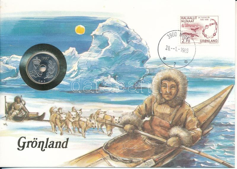 Grönland, benne Dánia 1987. 25ö felbélyegzett borítékban, bélyegzéssel, német nyelvű leírással T:UNC Greenland with Denmark 1987. 25 Öre coin in envelope with stamp and cancellation, with German description C:UNC