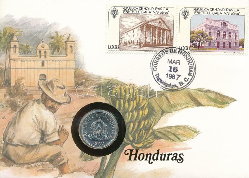 Honduras 1980. 10c Cu-Ni felbélyegzett borítékon, bélyegzéssel, német nyelvű leírással T:UNC Honduras 1980. 10 Centavos Cu-Ni in envelope with stamp, with German description C:UNC