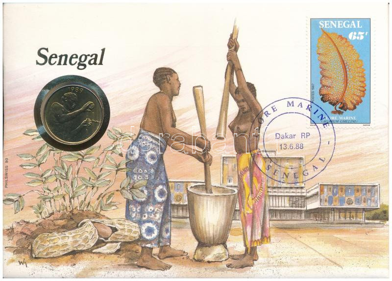 Közép-afrikai Államok 1989. 25Fr Al-bronz "Szenegál" felbélyegzett borítékban, bélyegzéssel, német nyelvű leírással T:UNC Central African States 1989. 25 Francs Al-bronze in "Senegal" envelope with stamp and cancellation, with German description C:UNC