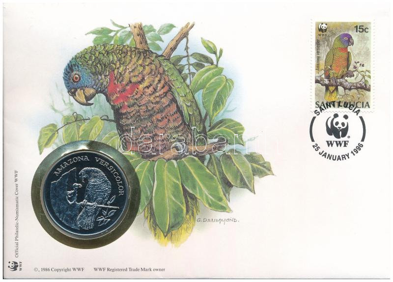 Saint Lucia DN (1991) "A Világ Vadvédelmi Alap (WWF) 30. évfordulója - Amazona Versicolor (Kékmaszkos Amazonpapagáj)" kétoldalas fém emlékérem érmés borítékban, bélyeggel és bélyegzéssel, német nyelvű ismertetővel T:PP Saint Lucia ND (1991) "30th Anniversary of the World Wildlife Fund - Amazona Versicolor" two-sided metal commemorative medallion in envelope with stamp and cancellation, with German description C:PP