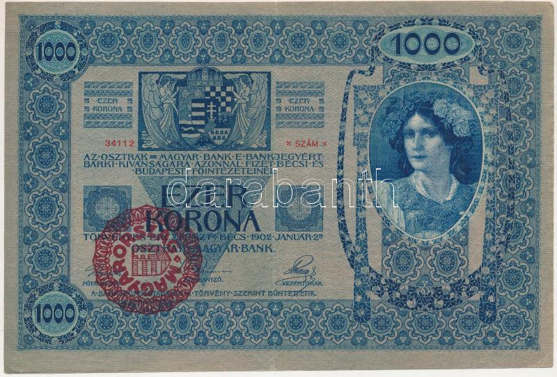 1902. 1000K "1563 34112", piros "MAGYARORSZÁG" fel... https://www.darabanth.com/de/472-Fernauktion/472.0/Numismatik/Ungarische-Banknoten~2000008/1902-1000K-1563-34112-piros-MAGYARORSZAG-felulbelyegzessel-TXF-Adamo-SK35B~II3200931