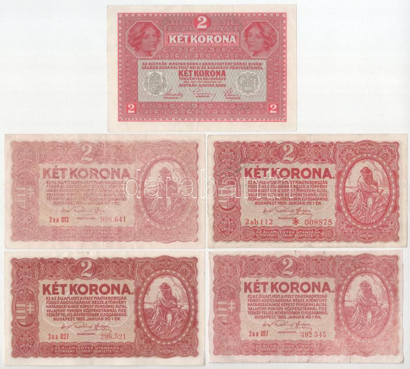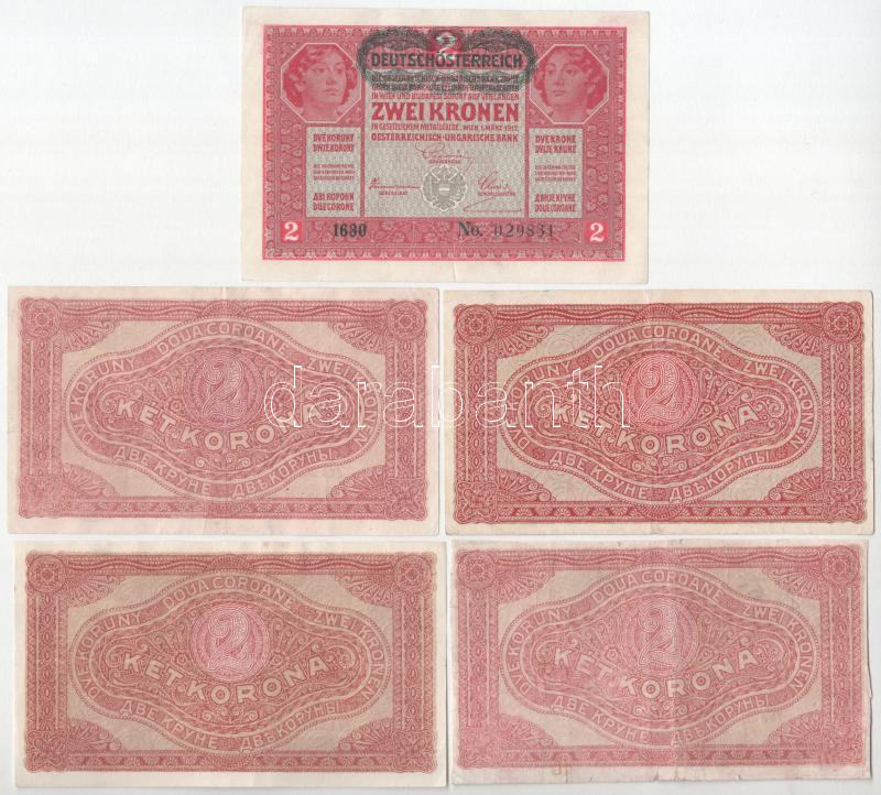 Beschreibung: 1917. 2K zöld "DEUTSCHÖSTERREICH" felülbélyegzéssel + 1920. 2K (4x) az egyik halvány, elmosódott előlapi nyomattal T:F,VG