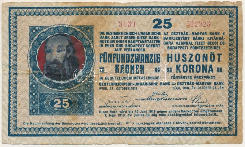 1918. 25K "3131", 3mm, hullámos hátlappal, propaganda (gúny)... https://www.darabanth.com/de/472-Fernauktion/472.0/Numismatik/Ungarische-Banknoten~2000008/1918-25K-3131-3mm-hullamos-hatlappal-propaganda-guny-rajzzal-TVG-folt-Adamo-K22AR~II3198663