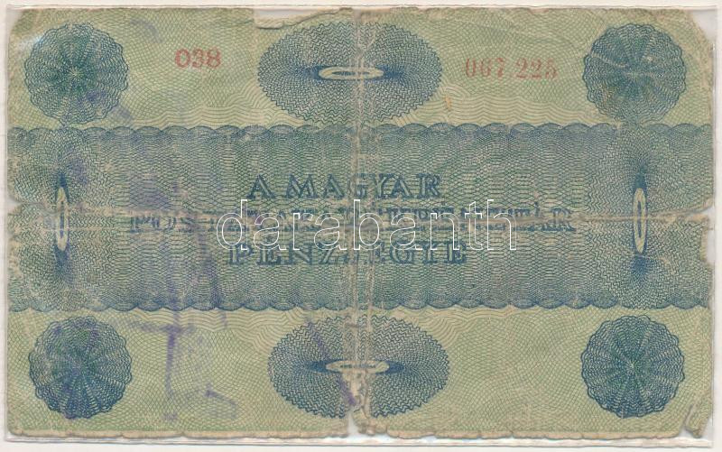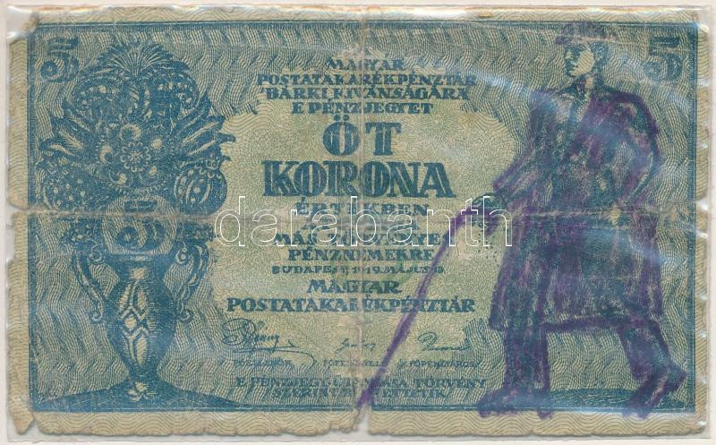 Beschreibung: 1919. 5K "MÁS TÖRVÉNYES..." előlapján gúnyrajz T:G szakadás, anyaghiány