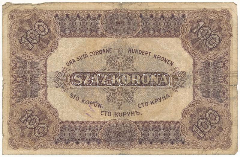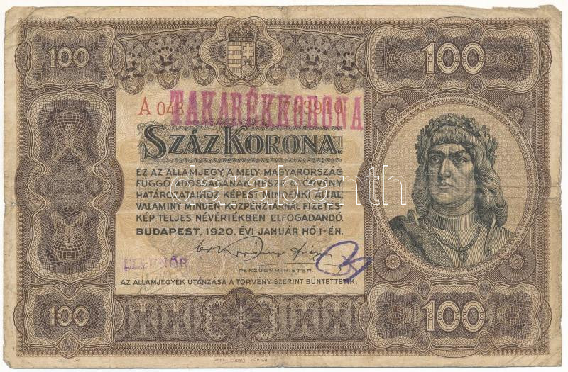 Beschreibung: 1920. 100K "Orell Füssli Zürich" nyomdahely jelöléssel, piros "TAKARÉKKORONA" és kék "Ellenőr" felülbélyegzéssel, aláírással T:F,VG