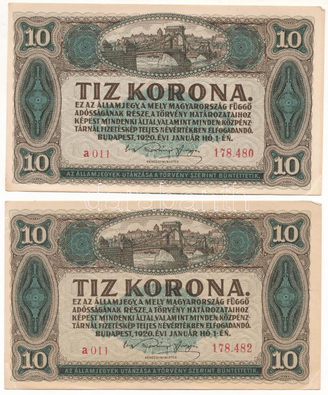 1920. 10K (2x) egyugrásos sorszámkövetők "a 011 178.480 , a 011 1... https://www.darabanth.com/de/472-Fernauktion/472.0/Numismatik/Ungarische-Banknoten~2000008/1920-10K-2x-egyugrasos-sorszamkovetok-a-011-178480-a-011-178482-TAU-sarokhajtasok--A~II3153182
