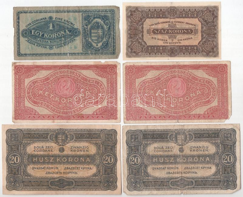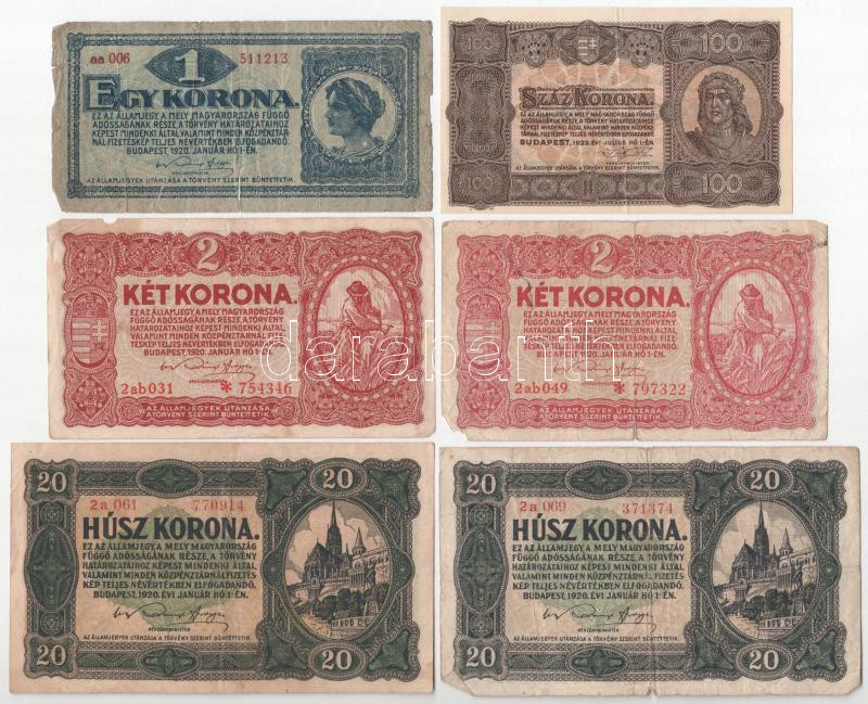 1920. 1K-100K (6x) T:F-VG szakadás https://www.darabanth.com/de/472-Fernauktion/472.0/Numismatik/Ungarische-Banknoten~2000008/1920-1K-100K-6x-TF-VG-szakadas~II3194885