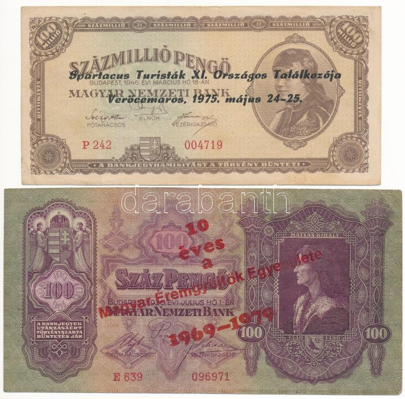 Beschreibung: 1930. 100P "10 éves a Magyar Éremgyűjtők Egyesülete 1964-1974" felülbélyegzéssel + 1945. 1000P "Spartacus Turisták XI. Találkozója Verőcemaros 1975. május. 24-25." felülbélyegzéssel T:F