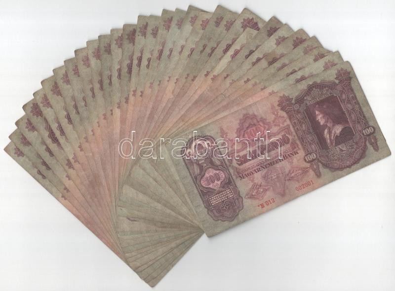 1930. 100P (30x) közte csillagos sorozatszám T:F,VG Adamo P17 https://www.darabanth.com/de/472-Fernauktion/472.0/Numismatik/Ungarische-Banknoten~2000008/1930-100P-30x-kozte-csillagos-sorozatszam-TF-VG-Adamo-P17~II3201630