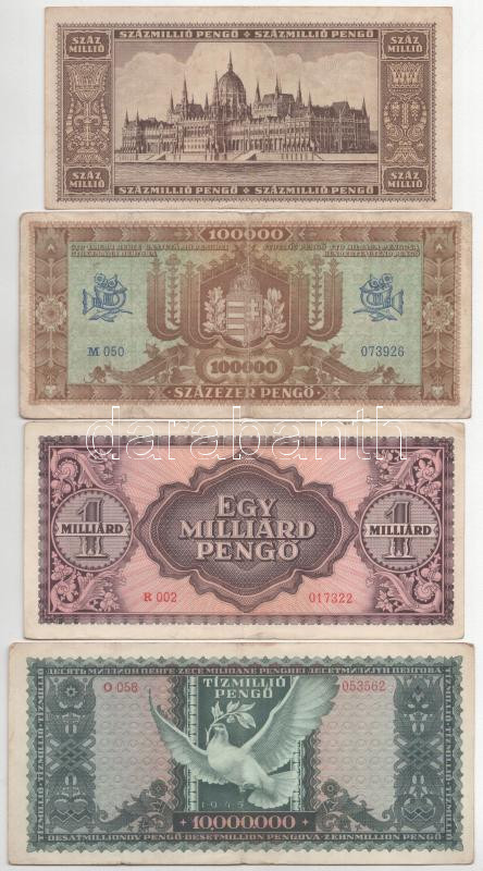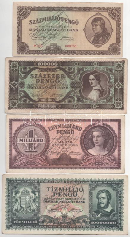 1945. 100.000P + 10.000.000P + 1946. 100.000.000P + 1.000.000.000P mind "Bélyeg- és Pénzkiállítás a Pengő bevezetésének 70. és a Forint 50 éves jubileuma alkalmából - Salgótarján, 1996. X. 14-25." felülbélyegzéssel T:F közte erős papír