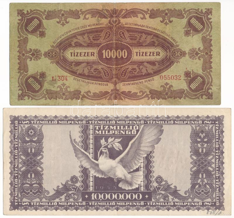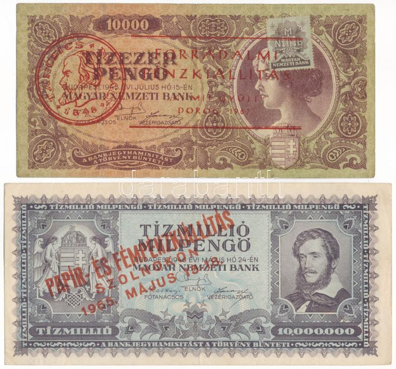 Beschreibung: 1945. 10.000P "MNB" bélyeggel, "Forradalmi Pénzkiállítás - 'Ki mit gyűjt' - Dorog 1967." felülbélyegzéssel + 1946. 10.000.000MP "Papír- és Fémpénzkiállítás Szolnokon 1965. Május 15-18." felülbélyegzéssel T:F