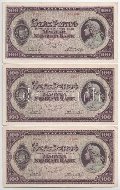 1945. 100P (3x) sorszámkövetők "E 244 042498 - E 244 042500"... https://www.darabanth.com/de/472-Fernauktion/472.0/Numismatik/Ungarische-Banknoten~2000008/1945-100P-3x-sorszamkovetok-E-244-042498-E-244-042500-TAU-sarokhajlasok-Adamo-P18~II3153125