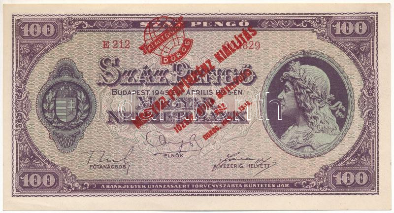Beschreibung: 1945. 100P "Ki mit gyűjt? Dorog - Magyar Papírpénz Kiállítás - József Attila Művelődési Ház - Dorog 1968. X. 13-16." felülbélyegzéssel T:AU