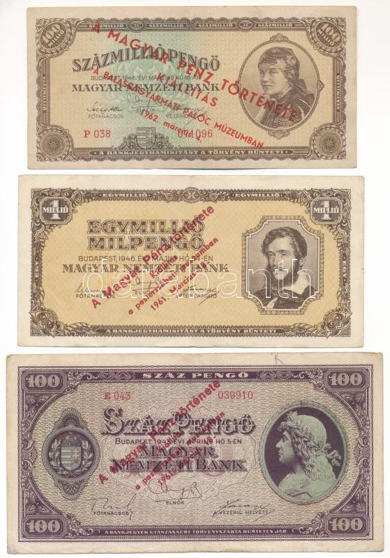 1945. 100P + 1946. 1.000.000MP mindkettő "A magyar pénz története kiállítás a pesterzsébeti múzeumban 1961. március 18" felülbélyegzéssel + 1946. 100.000.000P "A magyar pénz története kiállítás a balassagyarmati Palóc Múzeumban 1962. március 4" felülbélyegzéssel T:F
