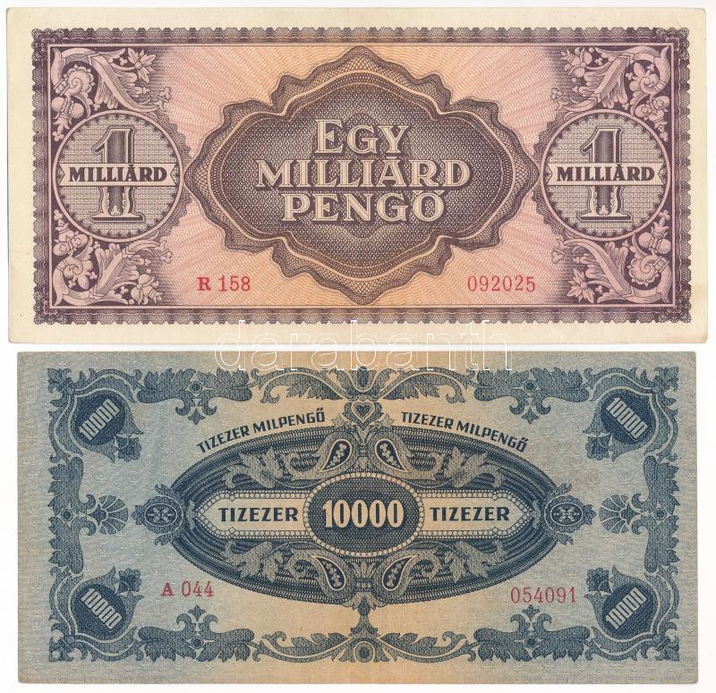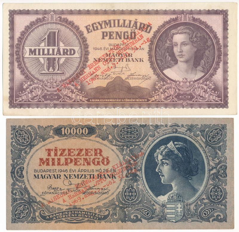 1946. 1.000.000.000P + 10.000MP mindkettő "A Miskolci Éremgyűjtők Kiállítása a Hermann Ottó Múzeumban 1969. aug. 5.-től 31-ig" felülbélyegzéssel T:F szép papír Adamo P36