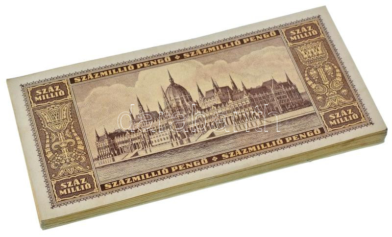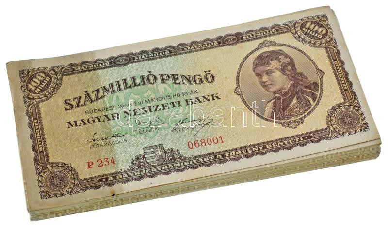 1946. 100.000.000P (84x) egyazon kötegből származó, töredékesen sorszámkövetők bankjegyek "P 234 068001 - P 234 068095" között T:AU hajtatlanok, de sarokhajlásokkal, első bankjegyen nagy elszíneződés, több bankjegyen az élek mentén kisebb, nagyobb fo.