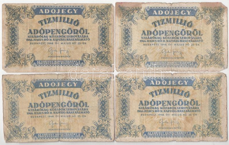 1946. 10.000.000AP (4x) T:VG Adamo P540 https://www.darabanth.com/de/472-Fernauktion/472.0/Numismatik/Ungarische-Banknoten~2000008/1946-10000000AP-4x-TVG-Adamo-P540~II3195265
