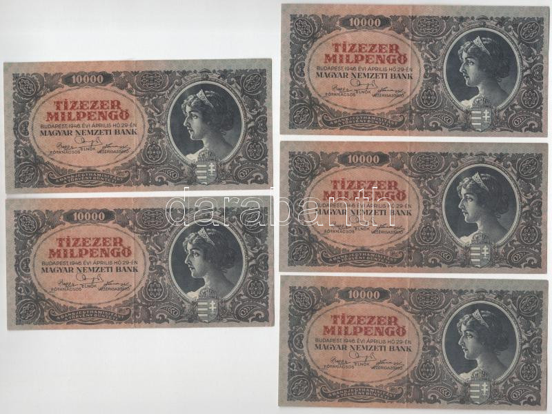 1946. 10.000MP (5x) sorszámkövetők "A 106 035816 - A 106 035820&q... https://www.darabanth.com/de/472-Fernauktion/472.0/Numismatik/Ungarische-Banknoten~2000008/1946-10000MP-5x-sorszamkovetok-A-106-035816-A-106-035820-TF-Adamo-P29~II3197019