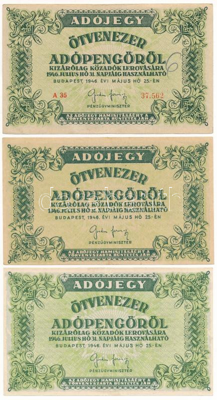 Beschreibung: 1946. 50.000AP (3xklf) sorszámmal és anélkül, vízjeles és sima papíron T:XF-F