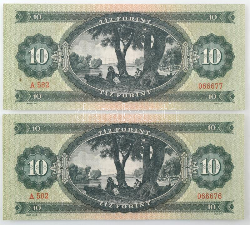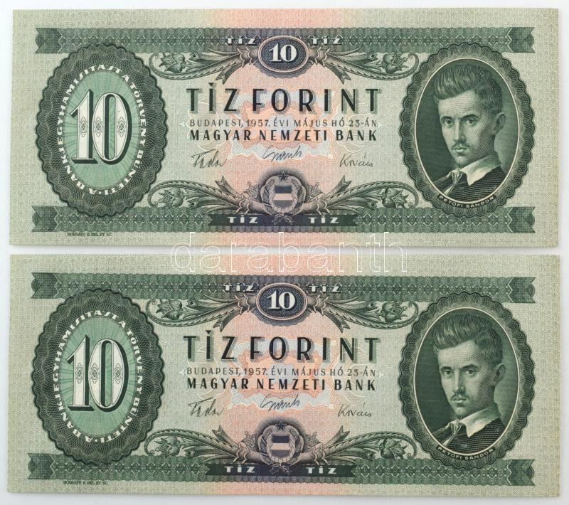 1957. 10Ft (2x) sorszámkövetők "A 582 066676 - A 582 066677"... https://www.darabanth.com/de/472-Fernauktion/472.0/Numismatik/Ungarische-Banknoten~2000008/1957-10Ft-2x-sorszamkovetok-A-582-066676-A-582-066677-TUNC-AU-Adamo-F4~II3168695