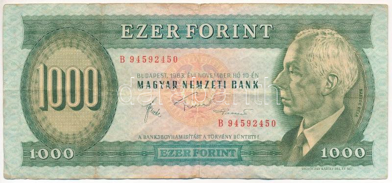 1983. november 10. 1000Ft "B 94592450" T:F,VG Adamo F45 https://www.darabanth.com/de/472-Fernauktion/472.0/Numismatik/Ungarische-Banknoten~2000008/1983-november-10-1000Ft-B-94592450-TF-VG-Adamo-F45~II3105109