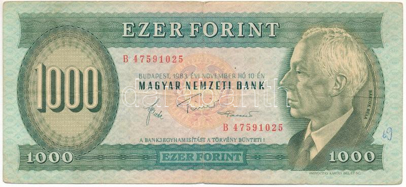 1983. november 10. 1000Ft "B" T:F Adamo F45 https://www.darabanth.com/de/472-Fernauktion/472.0/Numismatik/Ungarische-Banknoten~2000008/1983-november-10-1000Ft-B-TF-Adamo-F45~II3194854