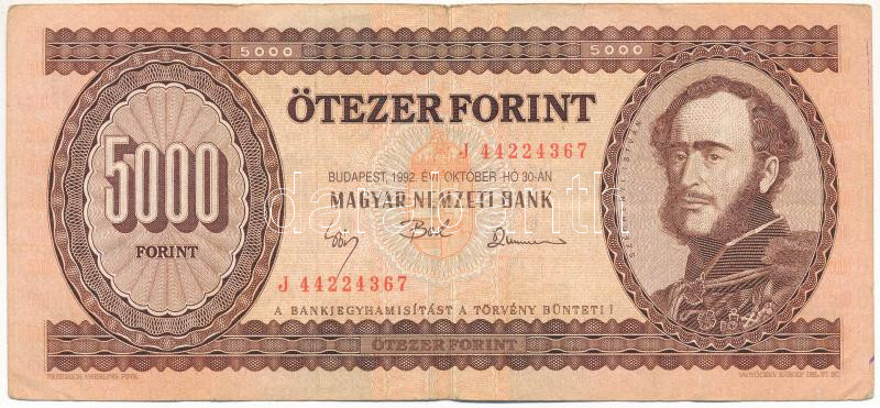 1992. 5000Ft "J" T:F Adamo F49 https://www.darabanth.com/de/472-Fernauktion/472.0/Numismatik/Ungarische-Banknoten~2000008/1992-5000Ft-J-TF-Adamo-F49~II3194859