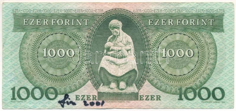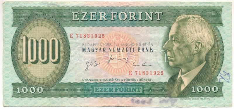 1996. 1000Ft "E 71831925" T:F Adamo F48 https://www.darabanth.com/de/472-Fernauktion/472.0/Numismatik/Ungarische-Banknoten~2000008/1996-1000Ft-E-71831925-TF-Adamo-F48~II3197899