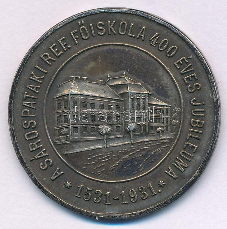 1931. "A Sárospataki Református Főiskola 400 Éves Jubileuma - 1531-1931 / Dicsérjétek és féljétek az Istent! - (Jel.K.XIV. 6-7.)" jelzett Ag emlékérem (19,25g/0.800/36mm) T:AU,XF patina