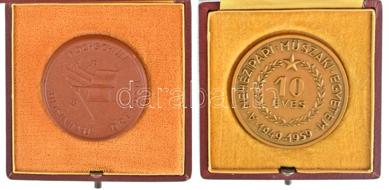 1959. "10 éves - A Nehézipari Műszaki Egyetem - 1949-1959 / NME" bronz emlékérem eredeti tokban (45mm) + NDK ~1970. "Drezdai Technikai Egyetem / Wilhelm Gotthelf Lohrmann" kerámia emlékérem a Meisseni Porcelánmanufaktúra gyártói jelzésével, eredeti tokban (42mm) T:AU