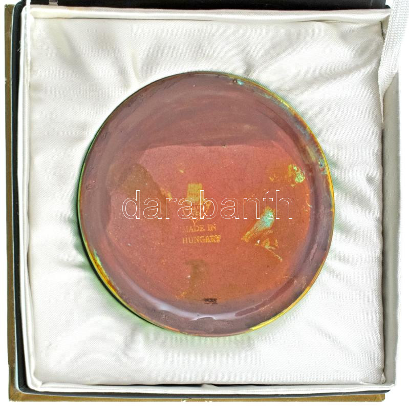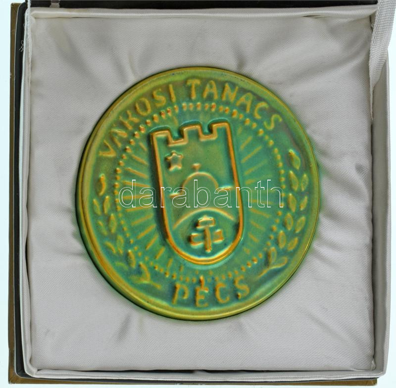 1970-1980 k. "Városi Tanács - Pécs" eozin mázas porcelán plakett, dísztokban (88mm) T:AU