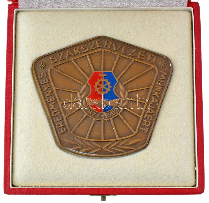 1977. "Eredményes Szakszervezeti Munkáért 1877-1903" egyoldalas, zománcbetétes bronz plakett, hátlapon "A centenáriumi központi vezetőségi ülés alkalmából 1977. március 3." gravírozással, eredeti tokban, minatűr jelvénnyel (79x91mm) T:UNC