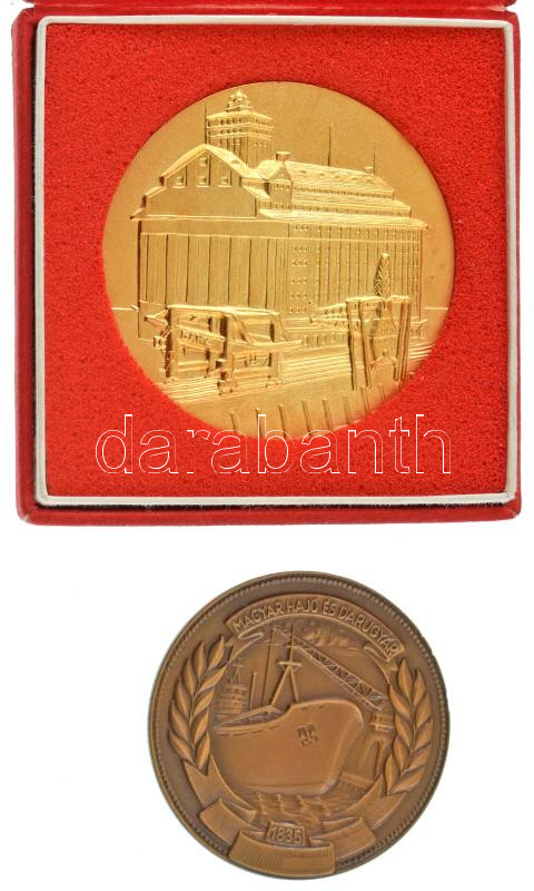 1978. "Nemzeti És Szabadkikötő Budapest 1928-1978" aranyozott bronz emlékérem dísztokban (70mm) + ~1960-1970. "Magyar Hajó és Darugyár 1835" bronz emlékérem (60mm) T:AU