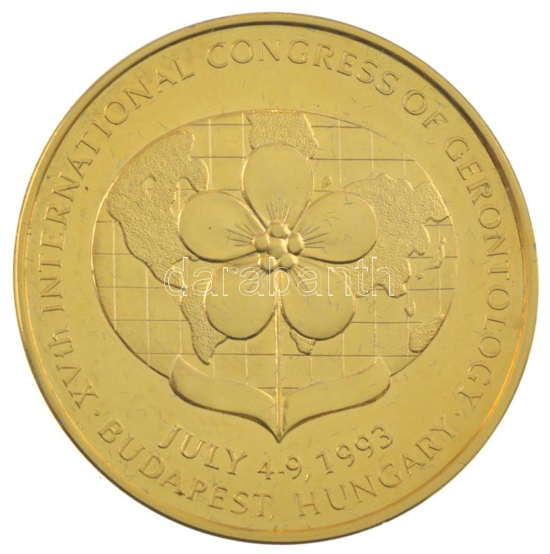 1993. "15. Nemzetközi Gerontológiai Kongresszus - Magyarország, Budapest 1993. július 4-9." egyoldalas aranyozott fém emlékérem sérült műanyag tokban (42mm) T:AU