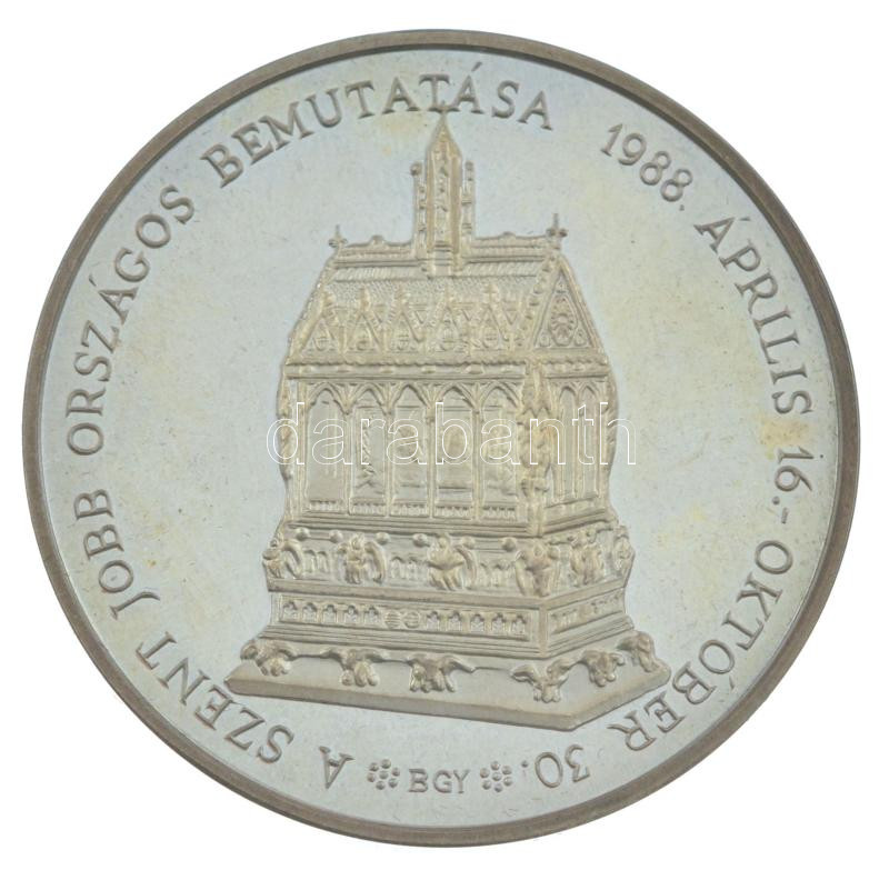 Bognár György (1944-) 1988. "Államalapító királyunk halálának emlékére 1038-1938 - MÉE / A Szent Jobb országos bemutatása" jelzett Ag emlékérem bársony szütyőben (36,11g/0.835/42,5mm) T:AU (PP) patina, ujjlenyomat Adamo BP25