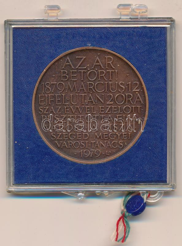 Lapis András (1942-) 1979. "Az ár betört! 1879 Március 12. éjfél után 2 óra - Száz évvel ezelőtt pusztította el a várost a Tisza - Szeged Megyei Városi Tanács" kétoldalas bronz emlékérem eredeti plombált ÁPV tokban (42,5mm) T:UNC,AU