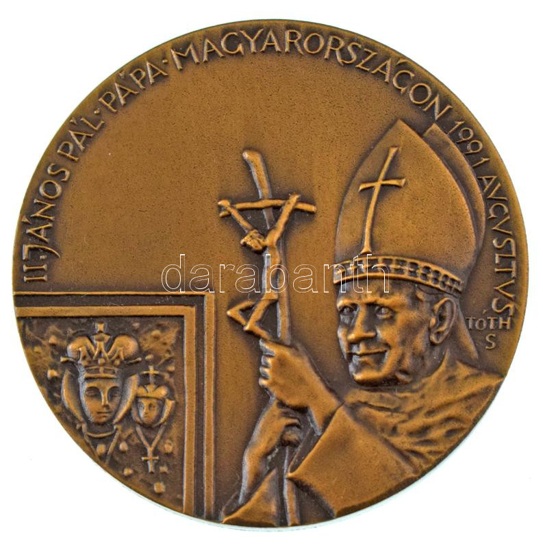 Tóth Sándor (1933-) 1991. "JOANNES PAVLVS II P M IN HVNGARIA XVI XX AVG MCMXCI / BUDAPEST ESZTERGOM PÉCS MÁRIAPÓCS DEBRECEN SZOMBATHELY" kétoldalas bronz emlékérem II. János Pál pápa magyarországi látogatása alkalmából, tokban (42,5mm) T:AU