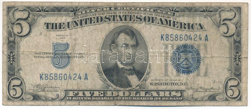 Amerikai Egyesült Államok 1934-1945. (1934A) 5$ "Silver Certificate - kisméretű" kék pecsét "William Alexander Julian - John Wesley Snyder" T:VG