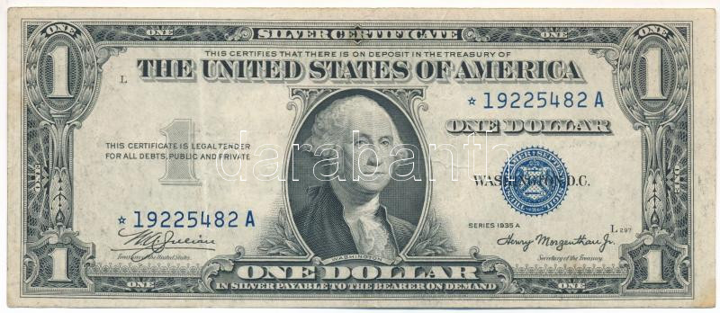Amerikai Egyesült Államok 1935A 1$ Silver Certificate - kisméretű", kék pecsét, "William Alexander Julian - Henry Morgenthau" sorszám előtt csillag (pótkiadás) T:F USA 1935A 1 Dollar "Silver Certificate - small size", blue seal, "William Alexander Julian - Henry Morgenthau" star before the serial number (replacement note) C:F Krause P#416a