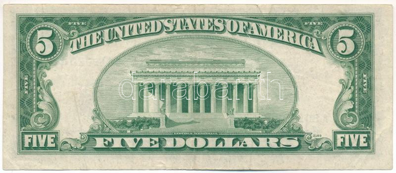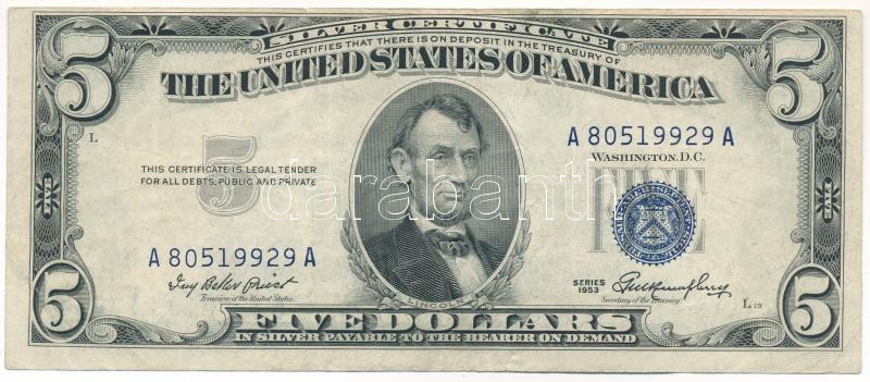 Amerikai Egyesült Államok 1953. 5$ "Silver Certificate - kisméretű" kék pecsét "Ivy Baker Priest - George Magoffin Humphrey" T:F kis beszakadás, amúgy erős papír USA 1953. 5 Dollars "Silver Certificate - Small size" blue seal "Ivy Baker Priest - George Magoffin Humphrey" C:F small tear, but strong paper