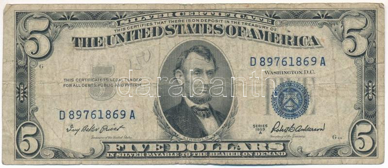 Amerikai Egyesült Államok 1953A 5$ "Silver Certificate - kisméretű" kék pecsét "Ivy Baker Priest - Robert Bernard Anderson" T:F,VG USA 1953A 5 Dollars "Silver Certificate - Small size" blue seal "Ivy Baker Priest - Robert Bernard Anderson" C:F,VG Krause P#417